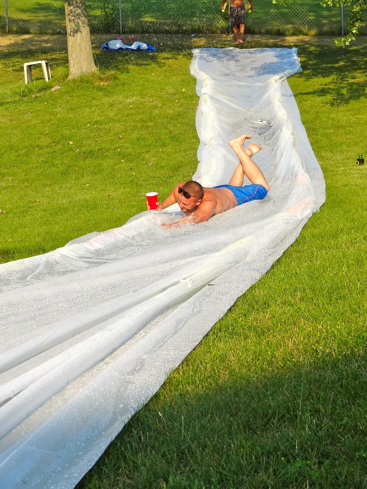 Now when I say slip 'n slide, I'm not talking the standard premade type you can buy at Target. This thing required 30 pool noodles, two (or three?) sprinklers, baby oil and a huge yard. I took this photo at about the 2/3 mark, so this isn't even the whole thing.